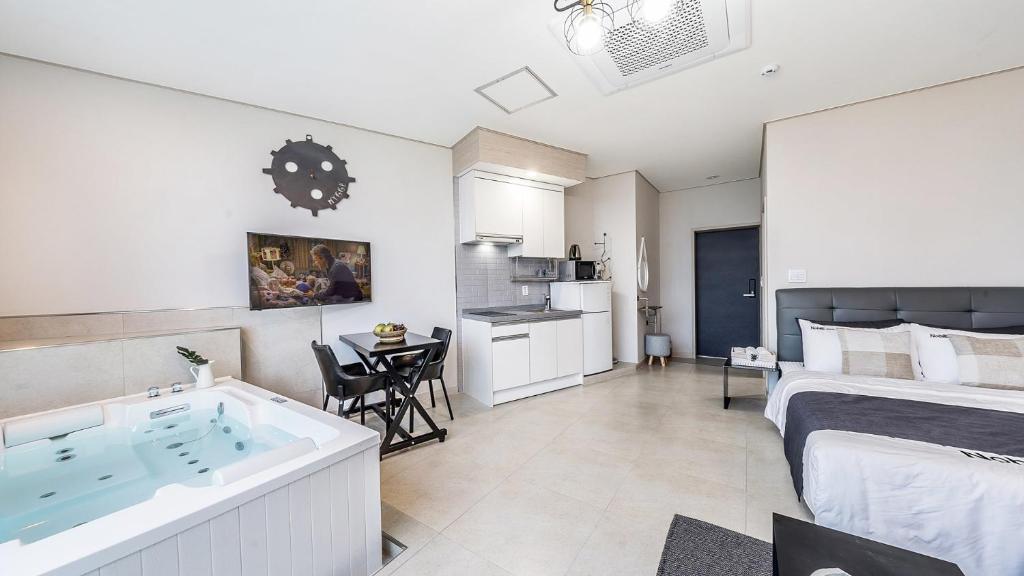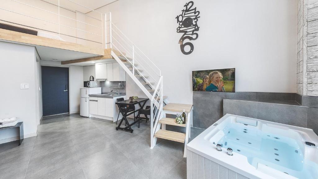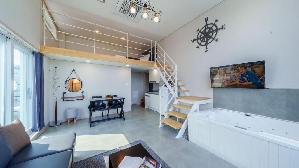 It's close to the main street, so most places are accessible by walking, and there are plenty of convenience stores nearby. There's no water in the room, but there's a water dispenser on the first floor of the pension. The owner is very friendly, and the unobstructed view is amazing! The whirlpool bathtub is the best!